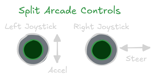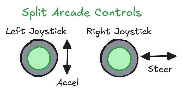 Split arcade controls are similar to arcade, but split across 2 different joysticks. This allows the driver to use both hands when driving the robot at the expense of an additional joystick input.