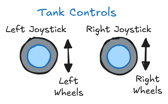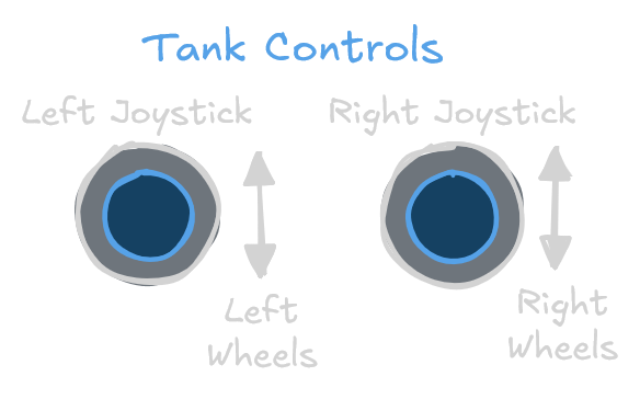Tank controls allow the robot to be driven using two separate joystick inputs for the left and right sides. This gives the driver more direct control over the drivetrain, but is less intuitive to use.