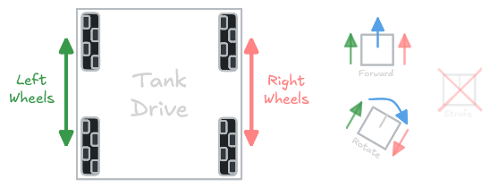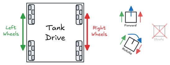 Tank drive is one of the most common drivetrain configurations due to its ease of use, reliability, and minimal complexity. It works by utilizing 2 sets of wheels on each side of the robot. These wheels can be traction wheels, omni wheels, or a combination of multiple types.