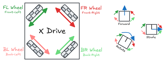 Mecanum, swerve, X-drive, and H-drive are all known as holonomic drivetrains. That is, they can move forwards, backwards, and sideways.